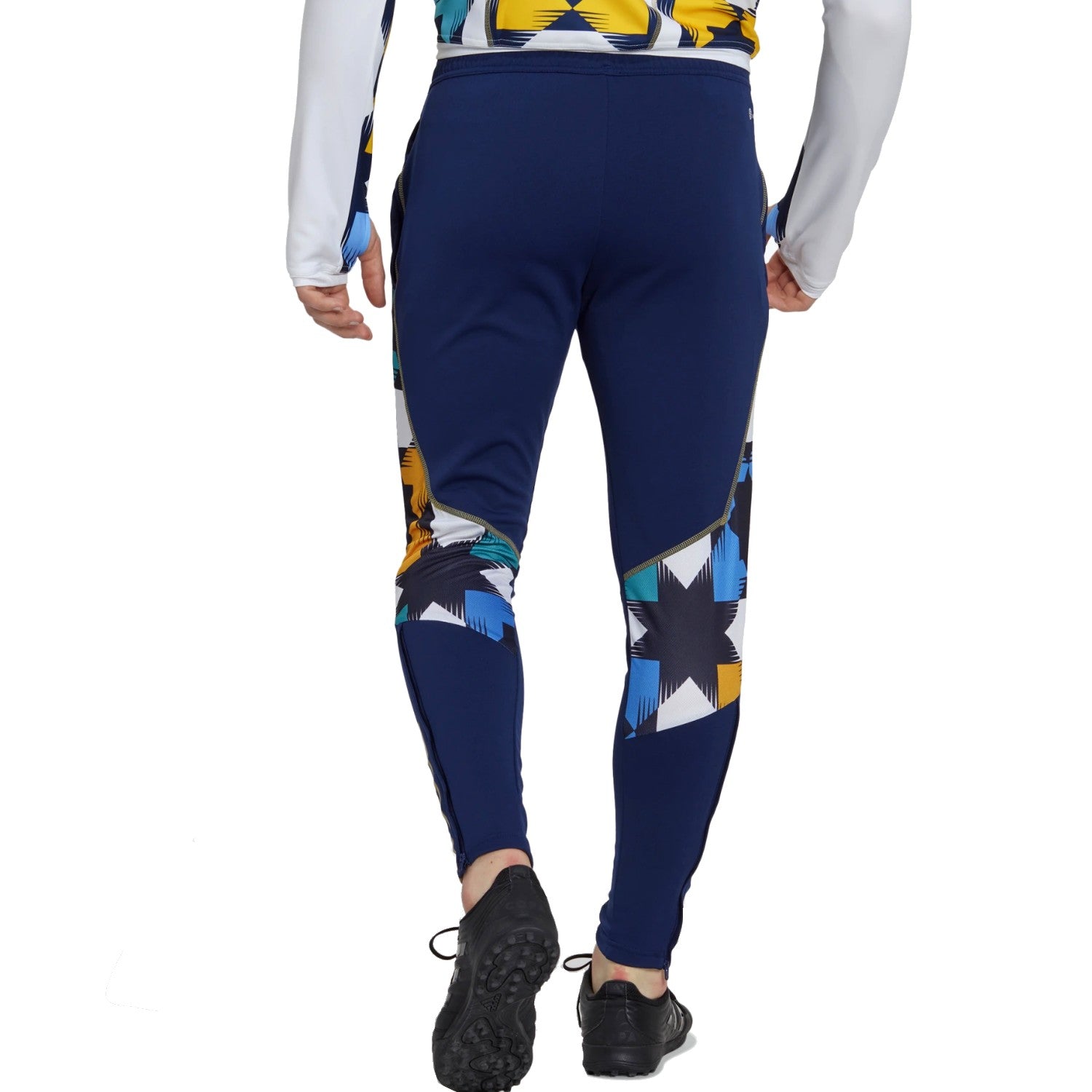 national soccer team technical training set for 2022/2023 international season, designed by technical sponsor Adidas for the iconic north african side. This stunning, modern looking collector's tracksuit features white 1/4 zip technical sweatshirt and matching navy training pants, both with gold stripes and a beautiful yellow/blue artistic pattern; comfortable pro feeling for your jogging and training session. Buy it now, show your soccer passion and wear with pride the colors of Algeria!
